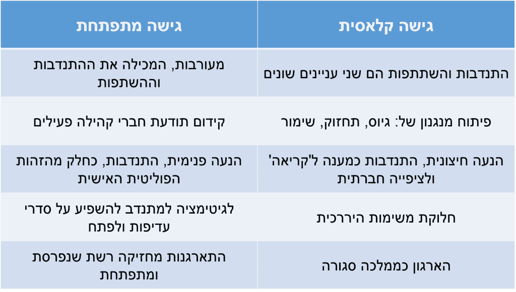 בתהליך למידה שנערך עם היחידה להתנדבות ומעורבות בחברה למתנ"סים, ניסו לאבחן יחד את השינויים בתופעת ההתנדבות, במיוחד ביחס של ארגונים אליהם. למול היחס הזה, אפיינו את גישת המתנ"סים שבפעילותם מצליחים לייצר רשת ענפה של פעילים סביבן, והעמדנו את התפיסות, זו מול זו: