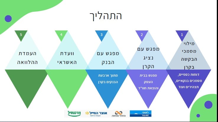 - שלב ראשון: הלווה צריך להגיש מסמכים לקרן. מדובר על לא מעט מסמכים הנוגעים בעיקר לצדדים הפיננסיים של העסק. אלו כוללים גם תצהירים, מסמכים כספיים ואישורים שונים מהבנק ומרשויות שונות, מה שמאפשר לקרן לקבל תמונה מלאה על מבקש ההלוואה. המסמכים כולם נשלחים במייל לקרן.