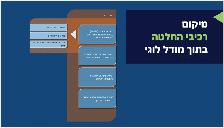 הגדרת מרכיבי ההחלטה מסייעת להבנת הקשרים בין מרכיב אחד למשנהו, מלמדת על התפתחות המדיניות בתחום בו אנו עוסקים, ומאפשרת הערכה נכונה יותר של הפעולות הנדרשות להמשך. תוצרי שלב זה יכולים להיות למשל התפתחות הנושא (כגון החלטות קודמות או החלטות המשך), פירוט השחקנים הרלוונטים ובעלי העניין, משאבים שהוקצו, מדדים שהוגדרו ועוד.